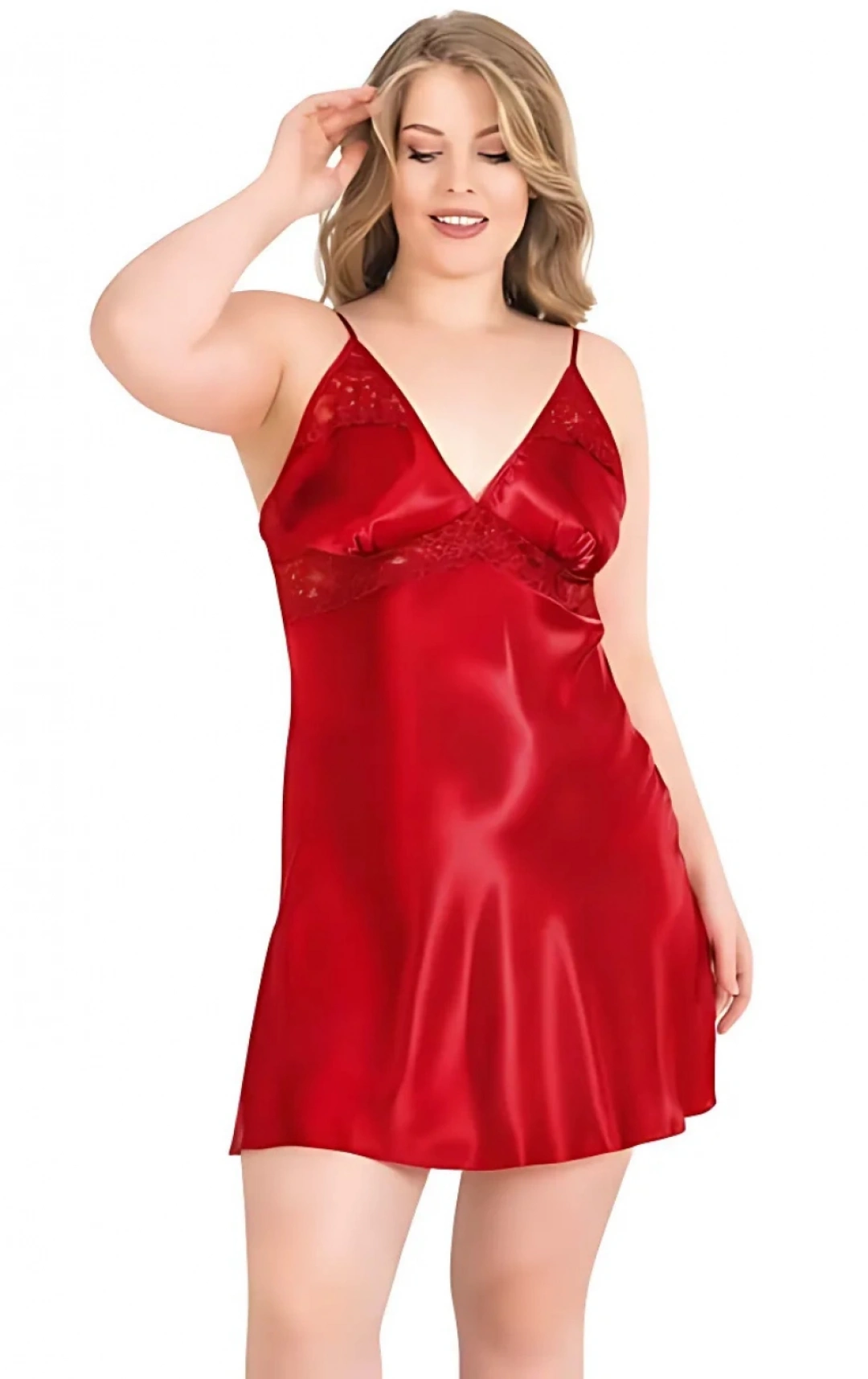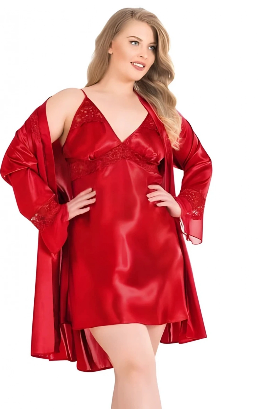 Kırmızı Büyük Beden Saten Kadın Sabahlık Gecelik Takım