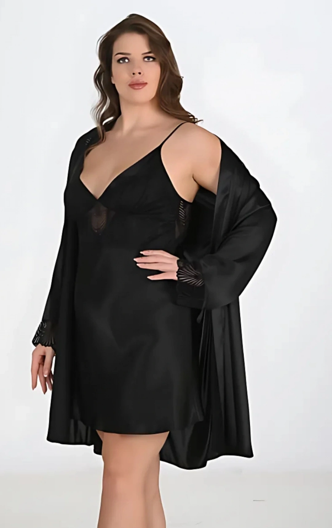 Siyah Büyük Beden Saten Kadın Sabahlık Gecelik Takım