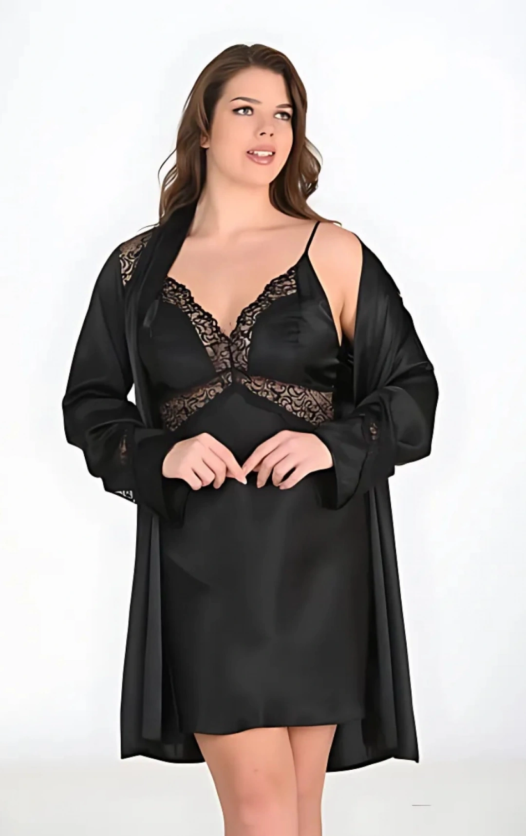 Siyah Büyük Beden Saten Kadın Sabahlık Gecelik Takım